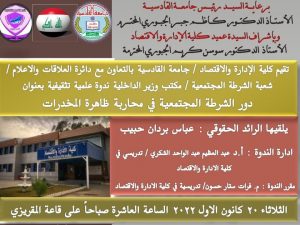 تقيم كلية الإدارة والاقتصاد / جامعة القادسية بالتعاون مع دائرة العلاقات والاعلام / شعبة الشرطة المجتمعية / مكتب وزير الداخلية ندوة علمية تثقيفية بعنوان
